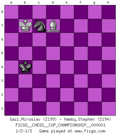 Last move : 1/2-1/2 2018 June 1 17:53:33 [Event "FICGS__CHESS__CUP_CHAMPIONSHIP__000001"] [Site "FICGS"] [Date "2017.09.28"] [Round "1"] [White "Gazi,Miroslav"] [Black "Hamby,Stephen"] [Result "1/2-1/2"] [WhiteElo "2199"] [BlackElo "2194"] 1.d4 Nf6 2.c4 e6 3.Nf3 Bb4+ 4.Nbd2 b6 5.a3 Bxd2+ 6.Qxd2 Bb7 7.e3 O-O 8.b3 Qe7 9.Be2 Rd8 10.O-O d5 11.Rd1 dxc4 12.bxc4 c5 13.Ne5 Ne8 14.Qb2 f6 15.Nf3 cxd4 16.exd4 Nc6 17.Bd2 Qd7 18.Bb4 Ne7 19.a4 Rab8 20.Nh4 Nd6 21.a5 bxa5 22.Bxa5 Rdc8 23.Qa2 g5 24.Nf3 Bxf3 25.gxf3 Kf7 26.Be1 Rc7 27.Qc2 Kg7 28.c5 Ndf5 29.Qe4 Qd5 30.Ba5 Rd7 31.Bc3 Nc6 32.Qxd5 exd5 33.f4 Rb3 34.Rd3 Rdb7 35.fxg5 fxg5 36.Re1 a5 37.Bg4 Nfe7 38.Rg3 h6 39.Bd1 Ra3 40.Bc2 Ra2 41.Bb1 Ra3 42.f4 g4 43.Bc2 h5 44.h3 Nb4 45.Bb1 Kf6 46.hxg4 hxg4 47.Rge3 Kf7 48.Bh7 Nbc6 49.Bc2 Nb4 50.Bd1 a4 51.Kh2 Na2 52.Ba1 Rxe3 53.Rxe3 Rb1 54.Bxg4 Rxa1 55.Ra3 Rf1 56.Bh5+ Kf6 57.Rxa2 Rxf4 58.Be8 Rxd4 59.Bb5 Nf5 60.Bd7 Ne3 61.Rxa4 Rxa4 62.Bxa4 d4 63.Kg3 d3 64.Kf3 Nd5 65.c6 d2 66.Bb3 d1Q+ 67.Bxd1 Nc7 68.Ke3 Ne8 69.Kd4 Ng7 70.Kc5 Ne8 71.Bg4 Nc7 72.Be2 Ne8 73.Kb6 Ke6 74.Bh5 Nf6 75.Bf3 Ne8 76.Be2 Nf6 77.Bf1 Ne8 78.Bg2 Nd6 79.c7 Nc8+ 80.Kb7 Ne7 81.Bh3+ Kd6 82.Bg2 Ke6 83.Bf1 Kd6 84.Bh3 Kd5 85.Bg4 Kc5 86.Bf5 Kb5 87.Bd7+ Ka5 88.Ka7 Kb4 89.Kb6 Nd5+ 90.Kb7 Nxc7 1/2-1/2 Bogo-Indian defense, Gruenfeld variation Kingside Castling by player Black (move 7) Kingside Castling by player White (move 10) 10 pieces endgame at move 57 : White KRBPP , Black KRNPP WHITE : King + 1 Rook 1 Bishop 2 Pawns BLACK : King + 1 Rook 1 Knight 2 Pawns 9 pieces endgame at move 58 : White KRBP , Black KRNPP WHITE : King + 1 Rook 1 Bishop 1 Pawn BLACK : King + 1 Rook 1 Knight 2 Pawns 8 pieces endgame at move 61 : White KRBP , Black KRNP WHITE : King + 1 Rook 1 Bishop 1 Pawn BLACK : King + 1 Rook 1 Knight 1 Pawn 7 pieces endgame at move 61 : White KBP , Black KRNP WHITE : King + 1 Bishop 1 Pawn BLACK : King + 1 Rook 1 Knight 1 Pawn 6 pieces endgame at move 62 : White KBP , Black KNP WHITE : King + 1 Bishop 1 Pawn BLACK : King + 1 Knight 1 Pawn Promotion Queen by player Black (move 66) 5 pieces endgame at move 67 : White KBP , Black KN WHITE : King + 1 Bishop 1 Pawn BLACK : King + 1 Knight 4 pieces endgame at move 90 : White KB , Black KN WHITE : King + 1 Bishop BLACK : King + 1 Knight This chess game ended in a draw. Follow this game move after move (download)A bad day of Chess is better than any good day at work. (Anonymous) Frage des Reporters: -Welche besonderen Umstände rechtfertigen das Anhalten der Uhren während einer Turnierpartie? Antwort: -Einen Fotographen zu strangulieren. (Siegbert Tarrasch) Después de la respuesta de las negras a 1.e4 con 1..e5, se quedan siempre tratando de entrar dentro del juego. (Howard Staunton) Karpov est une pièce de musée. (Garry Kasparov) The real voyage of discovery consists not in seeking new lands but in seeing with new eyes. (Marcel Proust)