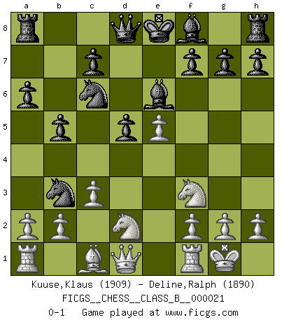 Last move : 0-1 2007 June 21 20:20:19 [Event "FICGS__CHESS__CLASS_B__000021"] [Site "FICGS"] [Date "2007.04.16"] [Round "1"] [White "Kuuse,Klaus"] [Black "Deline,Ralph"] [Result "0-1"] [WhiteElo "1909"] [BlackElo "1890"] 1.e4 e5 2.Nf3 Nc6 3.Bb5 a6 4.Ba4 Nf6 5.O-O Nxe4 6.d4 b5 7.Bb3 d5 8.dxe5 Be6 9.Nbd2 Nc5 10.c3 Nxb3 0-1 Ruy Lopez : Open, 7.Bb3 Kingside Castling by player White (move 5) Player Black won this chess game. Follow this game move after move (download)If one piece is badly posted, the whole game is bad. (Tarrasch) Mein erstes Ziel war nicht, die Partie zu gewinnen, sondern eine Figur zu opfern. -- der junge (Wilhelm Steinitz) Observen a Garry Kasparov. Después de una derrota, invariablemente el gana la próxima partida. Prácticamente hace pedazos a su siguiente oponente. Eso es algo que tenemos que aprender a lograr. (Maurice Ashley) Le jeu d'échecs fait naître et fortifie en nous plusieurs qualités précieuses dans le cours de l'existence, telles que la prévoyance, la circonspection, la prudence, et la persévérance. (Benjamin Franklin - 1783, la morale des échecs) Thus, what is of supreme importance in war is to attack the enemy's strategy. (Sun Tzu)