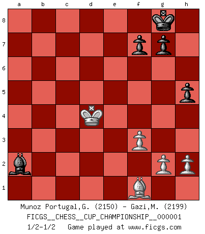Last move : 1/2-1/2 2018 February 5 10:45:2 [Event "FICGS__CHESS__CUP_CHAMPIONSHIP__000001"] [Site "FICGS"] [Date "2017.09.28"] [Round "1"] [White "Munoz Portugal,Guillermo"] [Black "Gazi,Miroslav"] [Result "1/2-1/2"] [WhiteElo "2150"] [BlackElo "2199"] 1.e4 c5 2.Nf3 d6 3.d4 cxd4 4.Nxd4 Nf6 5.Nc3 a6 6.Be3 e5 7.Nb3 Be6 8.f3 Be7 9.Qd2 h5 10.Be2 Nbd7 11.Nd5 Nxd5 12.exd5 Bf5 13.O-O Rc8 14.c4 Nf6 15.Na5 Qd7 16.Qb4 O-O 17.Qxb7 Qxb7 18.Nxb7 Rb8 19.Na5 Rxb2 20.Nc6 Bd8 21.Rf2 Re8 22.Bf1 Rb7 23.Rc1 a5 24.Rd2 Nd7 25.c5 Nxc5 26.Nxd8 Rxd8 27.Bxc5 dxc5 28.d6 Be6 29.Rxc5 Rb1 30.Kf2 a4 31.Rxe5 Rb6 32.Ra5 Rbxd6 33.Rxd6 Rxd6 34.Rxa4 Rd2+ 35.Ke3 Rxa2 36.Rxa2 Bxa2 37.Kd4 1/2-1/2 Sicilian : Najdorf, Byrne (English) attack Kingside Castling by player White (move 13) Kingside Castling by player Black (move 16) 10 pieces endgame at move 36 : White KBPPP , Black KBPPP WHITE : King + 1 Bishop 3 Pawns BLACK : King + 1 Bishop 3 Pawns This chess game ended in a draw. Follow this game move after move (download)Chess is a terrible game. If you have no center, your opponent has a freer position. If you do have a center, then you really have something to worry about ! (Siegbert Tarrasch) Es hat in meinem Leben Zeiten gegeben, da ich sehr nahe daran war zu glauben, daß ich auch nicht eine einzige Schachpartie verlieren könnte. (José Raúl Capablanca) Mis oponentes también hacen buenas movidas. A veces yo no tomo esas cosas en consideración. (Bobby Fischer) Dans le domaine de la peinture, de la gravure et de la sculpture, dès la première décennie de notre siècle, les artistes abandonnent la représentation de la partie d'échecs pour se concentrer sur les pièces, sur les échiquiers et sur toutes les variations auxquelles les unes et les autres peuvent donner lieu. On passe en quelque sorte d'un thème social à un thème musical (au sens de la musica médiévale, c'est-à-dire d'une notion qui inclue le rythme, l'harmonie, la construction et la déconstruction, etc.). Graphiquement et picturalement, l'échiquier apparaît comme une structure ouverte, dynamique, d'une richesse infinie, autorisant toutes les combinatoires et débouchant sur des mouvements et des rythmes de nature exponentielle. (Michel Pastoureau) Imagination is more important than knowledge. Knowledge is limited. Imagination encircles the world. (Albert Einstein)