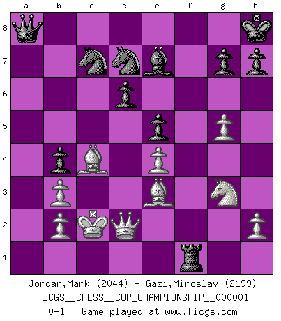 Last move : 0-1 2018 February 18 2:26:15 [Event "FICGS__CHESS__CUP_CHAMPIONSHIP__000001"] [Site "FICGS"] [Date "2017.09.28"] [Round "1"] [White "Jordan,Mark"] [Black "Gazi,Miroslav"] [Result "0-1"] [WhiteElo "2044"] [BlackElo "2199"] 1.e4 c5 2.Nf3 d6 3.d4 cxd4 4.Nxd4 Nf6 5.Nc3 a6 6.Be3 e5 7.Nb3 Be6 8.Qd2 Be7 9.f3 O-O 10.O-O-O Nbd7 11.g4 b5 12.g5 b4 13.Ne2 Ne8 14.f4 a5 15.f5 a4 16.fxe6 axb3 17.cxb3 fxe6 18.Bh3 Rxa2 19.Bxe6+ Kh8 20.Ng3 Nc7 21.Bc4 Qa8 22.Rhf1 Rxf1 23.Rxf1 Ra1+ 24.Kc2 Rxf1 0-1 This chess game has been lost on time (started : 2017.09.28 20:39:37) Sicilian : Najdorf, Byrne (English) attack Kingside Castling by player Black (move 9) Queenside Castling by player White (move 10) Player Black won this chess game. Follow this game move after move (download)Place the contents of the Chess box in a hat, shake them up vigorously, pour them on the board from a height of two feet, and you get the style of Steinitz. (H. E. Bird) Wer der Ansicht ist, daß alle Schachspieler verrückt sind, wird durch Studium des Lebens von Emil Josef Diemer nicht auf andere Gedanken kommen. (Hans Ree) Coloca el contenido de las piezas del Ajedrez en un sombrero, agitalo vigorosamente, arrojalas en un tablero desde una altura de 30 centimetros y así obtendras el estilo de Steinitz. (H. E. Bird) Les échecs, c'est l'imagination. (David Bronstein) Don't be irreplaceable, if you can't be replaced, you can't be promoted. (Dan Rotaru)