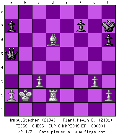 Last move : 1/2-1/2 2018 January 30 20:27:51 [Event "FICGS__CHESS__CUP_CHAMPIONSHIP__000001"] [Site "FICGS"] [Date "2017.09.28"] [Round "1"] [White "Hamby,Stephen"] [Black "Plant,Kevin D."] [Result "1/2-1/2"] [WhiteElo "2194"] [BlackElo "2191"] 1.c4 e6 2.d4 Nf6 3.Nc3 Bb4 4.f3 c5 5.d5 d6 6.e4 b5 7.Bd3 O-O 8.Nge2 bxc4 9.Bxc4 exd5 10.Bxd5 Nxd5 11.Qxd5 Be6 12.Qxa8 Qb6 13.O-O Nc6 14.Qxf8+ Kxf8 15.Bd2 h6 16.Rad1 Kg8 17.Be1 Ne5 18.Nf4 Qa6 19.Rf2 g5 20.Nfd5 Bxd5 21.Rxd5 c4 22.Kf1 Nd3 23.Rd2 Kg7 24.Bf2 Bxc3 25.bxc3 Qb7 26.Bg3 Qb1+ 27.Ke2 Kh7 28.Rd4 Nc1+ 29.Kf2 Nd3+ 30.Ke2 Qg1 31.R4xd3 cxd3+ 32.Kxd3 Qc5 33.Kc2 Qc4 34.Kb2 Qb5+ 35.Kc2 g4 36.fxg4 Qa6 37.Kd1 Qa4+ 38.Kc1 Qc6 39.Kb2 Qxe4 40.Bxd6 Qxg4 41.g3 Qg5 42.Kc1 Qa5 43.Kb2 Qb6+ 44.Kc2 Qa5 45.Kb2 Qb6+ 46.Kc2 Qa5 47.Kb2 1/2-1/2 English Opening Kingside Castling by player Black (move 7) Kingside Castling by player White (move 13) This chess game ended in a draw. Follow this game move after move (download)When your house is on fire, you can't be bothered with the neighbors. Or, as we say in Chess, if your King is under attack you don't worry about losing a Pawn on the Queen's side. (Gary Kasparov) Wenn du auf das Glück wartest, wird das Leben ziemlich langweilig. (Mikhail Nekhemyevich Tal) El pensamiento metódico es mas útil en el Ajedrez que la inspiración. (C. J. S. Purdy) En blitz, le Cavalier l'emporte sur le Fou. (Vlastimil Hort) The production of too many useful things results in too many useless people. (Karl Marx)