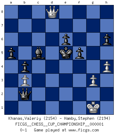 Last move : 0-1 2018 January 12 0:16:14 [Event "FICGS__CHESS__CUP_CHAMPIONSHIP__000001"] [Site "FICGS"] [Date "2017.09.28"] [Round "1"] [White "Khanas,Valeriy"] [Black "Hamby,Stephen"] [Result "0-1"] [WhiteElo "2154"] [BlackElo "2194"] 1.e4 e6 2.d4 d5 3.Nc3 Nf6 4.e5 Nfd7 5.f4 c5 6.Nf3 Nc6 7.Be3 Be7 8.Qd2 a6 9.Be2 O-O 10.O-O b5 11.Nd1 Qb6 12.c3 a5 13.Rc1 Ba6 14.f5 b4 15.Bxa6 Qxa6 16.f6 gxf6 17.exf6 Nxf6 18.Bh6 Ne4 19.Qf4 f5 20.Bxf8 Rxf8 21.Nf2 cxd4 22.Nxe4 dxe4 23.Nxd4 Qa7 24.Kh1 Nxd4 25.cxd4 Qxd4 26.Rc7 Re8 27.b3 Qd3 28.Rfc1 Qd4 29.Qg3+ Kf7 30.Qh3 Qg7 31.Rf1 Rg8 32.g3 h6 33.Qh5+ Qg6 34.Qe2 Qg4 35.Qd2 Qg7 36.Qd1 Qg5 37.Qe2 Qg4 38.Qd2 Qg7 39.Qd1 Qg5 40.Qc2 Rd8 41.Qxe4 Rd1 42.Qf3 Rxf1+ 43.Qxf1 Qd2 44.Kg1 Qxa2 45.Qd1 Kf6 46.Qd4+ Kf7 47.Qd1 Kf6 48.h4 Qb2 49.Qd7 Bf8 50.Qd8+ Ke5 51.Rc5+ Bxc5+ 0-1 French : Steinitz, Boleslavsky variation Kingside Castling by player Black (move 9) Kingside Castling by player White (move 10) Player Black won this chess game. Follow this game move after move (download)Chess opens and enriches your mind. (Saudin Robovic) Ich weiss nicht was Gott gegen mich auf 1.e4 antworten würde. (Robert James Fischer) Debió haber existido una vez en que los hombres eran semidióses, de otra manera no hubiesen podido inventar el Ajedrez. (Gustav Schenk) Horreur, mais aussi harmonie suprême : qu'y avait-il en effet au monde en dehors des échecs ? Le brouillard, l'inconnu, le non-être... (Vladimir Nabokov) It's not enough to succeed. Others must fail. (Gore Vidal)