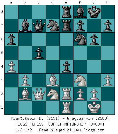 Last move : 1/2-1/2 2017 December 13 11:47:29 [Event "FICGS__CHESS__CUP_CHAMPIONSHIP__000001"] [Site "FICGS"] [Date "2017.09.28"] [Round "1"] [White "Plant,Kevin D."] [Black "Gray,Garvin"] [Result "1/2-1/2"] [WhiteElo "2191"] [BlackElo "2189"] 1.e4 e5 2.Nf3 Nc6 3.Bb5 a6 4.Ba4 Nf6 5.O-O Be7 6.Re1 b5 7.Bb3 d6 8.c3 O-O 9.h3 Nb8 10.d4 Nbd7 11.Nbd2 Bb7 12.Bc2 Re8 13.a4 Bf8 14.b3 b4 15.Bb2 bxc3 16.Bxc3 exd4 17.Bxd4 c5 18.Bb2 Re7 19.Bd3 Qc7 20.Qc2 Rae8 21.Re2 g6 22.Rd1 d5 23.Rde1 dxe4 1/2-1/2 Ruy Lopez : Closed Kingside Castling by player White (move 5) Kingside Castling by player Black (move 8) This chess game ended in a draw. Follow this game move after move (download)When asked, -How is that you pick better moves than your opponents?, I responded: I'm very glad you asked me that, because, as it happens, there is a very simple answer. I think up my own moves, and I make my opponent think up his. (Alexander Alekhine) Kasparov stellt für gewöhnlich die Regeln auf und bricht sie dann selbst wieder. (Alexej Shirov) Un Peón pasado aumenta su poder a medida de que el número de piezas en el tablero disminuye. (Capablanca) Le jeu d'échecs est comme rejeté hors du temps. (Antoine de Saint-Exupéry) The weakness of an artist is dogma. (Josh Waitzkin)