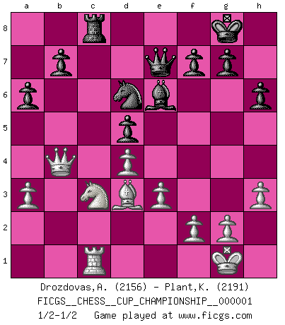 Last move : 1/2-1/2 2017 November 13 23:28:57 [Event "FICGS__CHESS__CUP_CHAMPIONSHIP__000001"] [Site "FICGS"] [Date "2017.09.28"] [Round "1"] [White "Drozdovas,Arturas"] [Black "Plant,Kevin D."] [Result "1/2-1/2"] [WhiteElo "2156"] [BlackElo "2191"] 1.d4 d5 2.c4 e6 3.Nc3 Nf6 4.cxd5 exd5 5.Bg5 c6 6.e3 h6 7.Bh4 Be7 8.Qc2 O-O 9.Bd3 Re8 10.Nge2 Nbd7 11.O-O Nh5 12.Bxe7 Qxe7 13.a3 Nhf6 14.Nf4 Nf8 15.b4 Ne6 16.Nxe6 Bxe6 17.Rfc1 Rec8 18.Qb2 Ne8 19.b5 cxb5 20.Nxb5 Rxc1+ 21.Rxc1 a6 22.Nc3 Rc8 23.h3 Nd6 24.Qb4 1/2-1/2 QGD : Exchange, positional line, 5...c6 Kingside Castling by player Black (move 8) Kingside Castling by player White (move 11) This chess game ended in a draw. Follow this game move after move (download)A thorough understanding of the typical mating continuations makes the most complicated sacrificial combinations leading up to them not only not difficult, but almost a matter of course. (Siegbert Tarrasch) Schach wird sich dank seiner hohen kulturellen Tradition immer durchsetzen. In näherer Zukunft womöglich sogar als Gegenreaktion auf die maßlose Reizüberflutung im Freizeit- und Spielbereich. (Garry Kasparov) Solo puedes ser bueno en el Ajedrez si amas al juego. (Bobby Fischer) On peut tirer plus d'utilité d'une partie perdue que de 100 parties gagnées. (Capablanca) Mandala - that's it! 16x16 squares as multiple of the four and the eight because of the Four Noble Truths and the Noble Eightfold Path. (Heinz-Georg Lehnhoff about Big Chess)