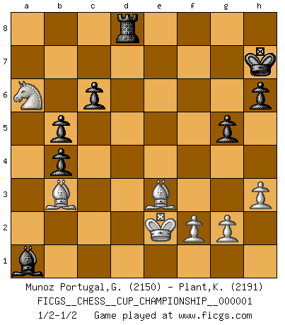 Last move : 1/2-1/2 2018 January 19 20:43:27 [Event "FICGS__CHESS__CUP_CHAMPIONSHIP__000001"] [Site "FICGS"] [Date "2017.09.28"] [Round "1"] [White "Munoz Portugal,Guillermo"] [Black "Plant,Kevin D."] [Result "1/2-1/2"] [WhiteElo "2150"] [BlackElo "2191"] 1.e4 e5 2.Nf3 Nc6 3.Bb5 a6 4.Ba4 Nf6 5.O-O Be7 6.Re1 b5 7.Bb3 O-O 8.c3 d6 9.h3 Re8 10.Ng5 Rf8 11.d4 Bb7 12.Nf3 Re8 13.Ng5 Rf8 14.Nf3 Re8 15.Nb1d2 Bf8 16.a3 g6 17.Ba2 Bg7 18.b4 exd4 19.cxd4 a5 20.Ng5 d5 21.e5 Nxd4 22.Bb2 Nh5 23.Nxf7 Qh4 24.Re4 dxe4 25.Bxd4 axb4 26.Rc1 Qe7 27.Bc5 Qd7 28.Nd6 Kh8 29.Nxb7 Nf4 30.Be3 Nd3 31.Nxe4 Rxe5 32.Nb7c5 Nxc5 33.Nxc5 Qxd1+ 34.Rxd1 R5e8 35.Ne6 Rxa3 36.Bd5 Be5 37.Ng5 Ra1 38.Rxa1 Bxa1 39.Kf1 h6 40.Ne6 c6 41.Bb3 Kh7 42.Ke2 g5 43.Nc7 Rd8 44.Ne6 Re8 45.Nc7 Rd8 46.Na6 1/2-1/2 Ruy Lopez : Closed, 7...O-O Kingside Castling by player White (move 5) Kingside Castling by player Black (move 7) This chess game ended in a draw. Follow this game move after move (download)For me, Chess is life and every game is like a new life. Every Chess player gets to live many lives in one lifetime. (Eduard Gufeld) Das Blackmar-Diemer-Gambit verändert den ganzen Menschen! (Emil Joseph Diemer) Realmente no sabemos como el juego fue inventado, aunque hay sospechas. Tan pronto como descubramos a los culpables, se los haremos saber. (Bruce Pandolfini) Aux échecs, les retours au sommet sont rares : les dommages psychologiques consécutifs à une défaite sont trop sévères. (Daily Telegraph) They say in chess you've got to kill the queen, and then you mate it... Oh I, do you ? (Red Hot Chili Peppers, Fortune faded)