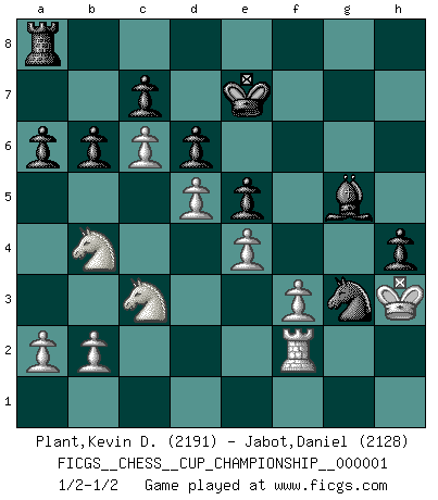 Last move : 1/2-1/2 2018 February 8 18:8:24 [Event "FICGS__CHESS__CUP_CHAMPIONSHIP__000001"] [Site "FICGS"] [Date "2017.09.28"] [Round "1"] [White "Plant,Kevin D."] [Black "Jabot,Daniel"] [Result "1/2-1/2"] [WhiteElo "2191"] [BlackElo "2128"] 1.d4 Nf6 2.c4 g6 3.Nc3 Bg7 4.e4 O-O 5.Be2 d6 6.Nf3 e5 7.O-O Nc6 8.d5 Ne7 9.Ne1 Nd7 10.Be3 f5 11.f3 f4 12.Bf2 g5 13.Nd3 Nf6 14.c5 Ng6 15.Nb4 Rf7 16.Kh1 h5 17.c6 b6 18.Ba6 g4 19.Be1 g3 20.Bxc8 Qxc8 21.hxg3 fxg3 22.Bxg3 h4 23.Bh2 Nh5 24.f4 Ngxf4 25.Bxf4 Nxf4 26.Nd3 Bh6 27.Ne2 Nh5 28.Rxf7 Kxf7 29.Qf1+ Nf6 30.Nc3 Qg4 31.Qf3 Rg8 32.Rf1 Qxf3 33.gxf3 Nh5 34.Rg1 Ng3+ 35.Kh2 a6 36.Rg2 Bg5 37.Rf2 Ke7 38.Kh3 Rf8 39.Nb4 Ra8 1/2-1/2 King's Indian : 4.e4 Kingside Castling by player Black (move 4) Kingside Castling by player White (move 7) This chess game ended in a draw. Follow this game move after move (download)In the perfect Chess combination as in a first-rate short story, the whole plot and counter-plot should lead up to a striking finale, the interest not being allayed until the very last moment. (Yates and Winter) Es ist nicht das erste mal, dass sich die FIDE dem Arabischen Geld gebeugt hat (über die FIDE WM 2004 in Lybien). (Larry Evans) Muchos jugadores de Ajedrez se sorprendían cuando después de la partida, Fischer explicaba con calma: 'Yo ya había analizado esta posibilidad' en una posición en la cual yo creía que no era posible de prever desde la apertura. (Mikhail Tal) Les Echecs sont affaire de jugement sensible. Savoir quand frapper et quand esquiver. (Fischer) In theory there is no difference between theory and practice. In practice there is. (Yogi Berra)