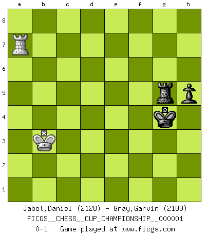 Last move : 0-1 2018 February 2 23:18:34 [Event "FICGS__CHESS__CUP_CHAMPIONSHIP__000001"] [Site "FICGS"] [Date "2017.09.28"] [Round "1"] [White "Jabot,Daniel"] [Black "Gray,Garvin"] [Result "0-1"] [WhiteElo "2128"] [BlackElo "2189"] 1.e4 c5 2.Nf3 d6 3.d4 cxd4 4.Nxd4 Nf6 5.Nc3 a6 6.Bg5 e6 7.f4 Be7 8.Qf3 Qc7 9.O-O-O Nbd7 10.Bd3 b5 11.Rhe1 Bb7 12.Nd5 exd5 13.Nf5 Kf8 14.Qg3 dxe4 15.Bxe4 Bxe4 16.Rxe4 Qc5 17.Bxf6 Bxf6 18.Nxd6 Nb6 19.Qb3 Qc7 20.Qb4 Be7 21.Qd4 Bxd6 22.Qxd6+ Qxd6 23.Rxd6 Rb8 24.b3 h5 25.f5 Rh6 26.Rxh6 gxh6 27.Rd4 Rb7 28.Rd6 Kg7 29.Kb2 a5 30.Ka3 Nd7 31.h3 Rc7 32.Kb2 b4 33.Rd5 Nc5 34.a3 Kf6 35.Rd6+ Kg5 36.axb4 axb4 37.Rd5 Rc6 38.Rd4 Na6 39.g4 Rc5 40.Rd7 hxg4 41.hxg4 Kxg4 42.Rxf7 Rxf5 43.Rg7+ Rg5 44.Ra7 Nc5 45.c3 bxc3+ 46.Kxc3 Nxb3 47.Kxb3 h5 0-1 Sicilian : Najdorf, 7...Be7 Queenside Castling by player White (move 9) 10 pieces endgame at move 42 : White KRPPP , Black KRNPP WHITE : King + 1 Rook 3 Pawns BLACK : King + 1 Rook 1 Knight 2 Pawns 9 pieces endgame at move 42 : White KRPP , Black KRNPP WHITE : King + 1 Rook 2 Pawns BLACK : King + 1 Rook 1 Knight 2 Pawns 8 pieces endgame at move 45 : White KRP , Black KRNPP WHITE : King + 1 Rook 1 Pawn BLACK : King + 1 Rook 1 Knight 2 Pawns 7 pieces endgame at move 46 : White KRP , Black KRNP WHITE : King + 1 Rook 1 Pawn BLACK : King + 1 Rook 1 Knight 1 Pawn 6 pieces endgame at move 46 : White KR , Black KRNP WHITE : King + 1 Rook BLACK : King + 1 Rook 1 Knight 1 Pawn 5 pieces endgame at move 47 : White KR , Black KRP WHITE : King + 1 Rook BLACK : King + 1 Rook 1 Pawn Player Black won this chess game. Follow this game move after move (download)It began to feel as though you were playing against Chess itself. - On playing against Robert Fischer. (Walter Shipman) Capablanka war das größte Genie der Schachgeschichte! Aber denken sie nicht er habe nichts vom Schach verstanden. Er wusste nur soviel wie er wissen musste um seine Ziele zu erreichen. (Mikhail Moiseyevich Botvinik) Yo he agregado estos principios a la ley: pongan los Caballos en acción antes de que los dos Alfiles sean desarrollados. (Emanuel Lasker) Un footballeur joue avec ses pieds, parfois avec sa tête. Un joueur d'échecs ne joue qu'avec sa tête. Et quand il ne joue plus, il meurt. (Jacob Murray) The best weapon against an enemy is another enemy. (Friedrich Nietzsche)