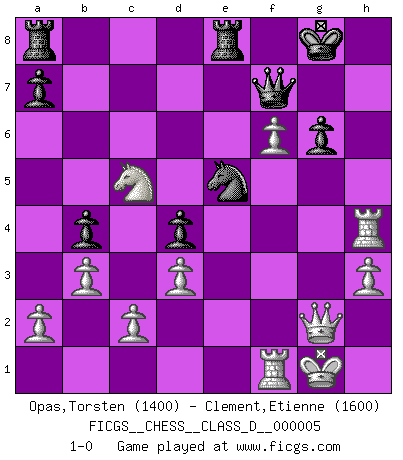 Last move : 1-0 2006 October 2 22:31:53 [Event "FICGS__CHESS__CLASS_D__000005"] [Site "FICGS"] [Date "2006.06.01"] [Round "1"] [White "Opas,Torsten"] [Black "Clement,Etienne"] [Result "1-0"] [WhiteElo "1400"] [BlackElo "1600"] 1.e4 c5 2.Nc3 Nc6 3.Nf3 Nf6 4.Bb5 e5 5.Bxc6 dxc6 6.Nxe5 Bd6 7.Nf3 O-O 8.d3 Qc7 9.O-O Bg4 10.h3 Bh5 11.Qe2 Rfe8 12.g4 Bg6 13.Be3 b5 14.Nh4 b4 15.Na4 Qa5 16.b3 Be5 17.Rae1 Bd4 18.Bxd4 cxd4 19.f4 h6 20.Qf2 c5 21.g5 Nd7 22.f5 Bh5 23.gxh6 Qa6 24.hxg7 Qf6 25.Kh1 Kxg7 26.e5 Qc6 27.Kh2 Kh7 28.f6 Qc7 29.Qg2 Bg6 30.Nxg6 fxg6 31.Kg1 Nxe5 32.Re4 Qf7 33.Rh4+ Kg8 34.Nxc5 1-0 Sicilian : Closed, 2...Nc6 Kingside Castling by player Black (move 7) Kingside Castling by player White (move 9) Player White won this chess game. Follow this game move after move (download)All I want to do, ever, is just play Chess. (Bobby Fischer) Um sich vor der Gefahr einer Erkältung zu schützen, sorge der wanderlustige König beizeiten für ein brauchbares Versteck. (Aaron Nimzowitsch) Cuando me preguntan: -¿Cual es el secreto que te hace hacer mejores movidas que tus oponentes?, Yo respondo: Me da gusto que me pregunten eso, porque, como veran, hay una simple razón. Yo pienso mis propias movidas y dejo a mi oponente que el piense las suyas. (Alexander Alekhine) L'action d'une oeuvre littéraire se déroule sur un champ de bataille. Les masques et les types du drame moderne correspondent aux pièces du jeu d'échecs. L'intrigue correspond aux coups et aux gambits, c'est à dire aux techniques du jeu telles qu'utilisées et interprétées par les joueurs. Les tactiques et les péripéties [mouvements] correspondent aux coups exécutés par l'adversaire. (Viktor Shklovsky) Macintosh - we might not get everything right, but at least we knew the century was going to end. (Douglas Adams)