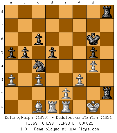 Last move : 1-0 2007 October 28 19:37:49 [Event "FICGS__CHESS__CLASS_B__000021"] [Site "FICGS"] [Date "2007.04.16"] [Round "1"] [White "Deline,Ralph"] [Black "Dudulec,Konstantin"] [Result "1-0"] [WhiteElo "1890"] [BlackElo "1931"] 1.c4 e5 2.g3 f5 3.Bg2 Nf6 4.Nc3 Bb4 5.Nf3 Nc6 6.O-O e4 7.Nh4 d6 8.d3 Bxc3 9.bxc3 O-O 10.dxe4 Nxe4 11.Qd5+ Kh8 12.Bxe4 fxe4 13.Qxe4 Bh3 14.Re1 Qf6 15.Qf3 Qe7 16.Qh5 Ne5 17.Ng6+ Nxg6 18.Qxh3 Ne5 19.Bf4 Nxc4 20.Rad1 Qf7 21.Qg2 b5 22.Rd4 Rae8 23.Qd5 Qxd5 24.Rxd5 c6 25.Rd4 d5 26.h4 Re6 27.Kg2 Kg8 28.Rd3 a5 29.R3d1 Kf7 30.Rd3 Rfe8 31.Rf3 Kg6 32.Kf1 h6 33.Rd3 Kh5 34.f3 g5 35.hxg5 hxg5 36.g4+ Kg6 37.Bc1 R6e7 38.a3 Rh7 39.R3d1 Reh8 40.Kf2 Rh2+ 41.Kg1 1-0 English Opening Kingside Castling by player White (move 6) Kingside Castling by player Black (move 9) Player White won this chess game. Follow this game move after move (download)Live, lose, and learn, by observing your opponent how to win. (Amber Steenbock) Alle offensichtlichen Züge sehen nach dem Spiel in der Analyse verdächtig aus. (Viktor Kortschnoi) Los libros de Ajedrez deben de usarse igual como usamos los anteojos: para mejorar la vista, aunque algunos jugadores los quieren usar como si ellos les otorgaran la vision. (José Raúl Capablanca) Le joueur d'Echecs qui veut atteindre le top est obligé de développer son propre credo créatif. Alexeï Stepanovicth Souétine. Il est facile d'écrire des livres ! Ce qui est difficile, c'est de jouer ! (Alexeï Stepanovicth Souétine) I live to kill Traxler counterattack. (Ilmars Cirulis)