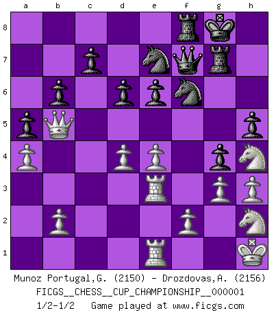 Last move : 1/2-1/2 2017 December 4 7:21:28 [Event "FICGS__CHESS__CUP_CHAMPIONSHIP__000001"] [Site "FICGS"] [Date "2017.09.28"] [Round "1"] [White "Munoz Portugal,Guillermo"] [Black "Drozdovas,Arturas"] [Result "1/2-1/2"] [WhiteElo "2150"] [BlackElo "2156"] 1.e4 e5 2.Bc4 Nf6 3.d3 Nc6 4.Nf3 Bc5 5.O-O d6 6.c3 O-O 7.a4 a5 8.Re1 h6 9.h3 Be6 10.Bxe6 fxe6 11.Be3 Bxe3 12.Rxe3 Qe8 13.Nb1d2 Qd7 14.Qb3 Rf7 15.g3 Raf8 16.Kg2 b6 17.Rf1 g5 18.Re2 Kh7 19.Re3 Kg7 20.Re2 Kh7 21.Nh2 Rg7 22.Nd2f3 Qf7 23.Re3 Kg8 24.Qb5 Ne7 25.d4 exd4 26.cxd4 Qg6 27.Rf1e1 h5 28.Kh1 g4 29.Nh4 Qf7 1/2-1/2 Bishop's Opening : Berlin defense Kingside Castling by player White (move 5) Kingside Castling by player Black (move 6) This chess game ended in a draw. Follow this game move after move (download)All my games are real. (Bobby Fischer) Ein Springer auf f6 gegen die eigene Rochadestellung ist schlimmer als ein rostiger Nagel im Knie. (Efim Bogoljubov) En el tablero, la mentira e hipocresía no sobreviven mucho. (Emanuel Lasker) A chaque perte on perd un peu de soi. (Joël Lautier) Computers are like Old Testament gods; lots of rules and no mercy. (Joseph Campbell)
