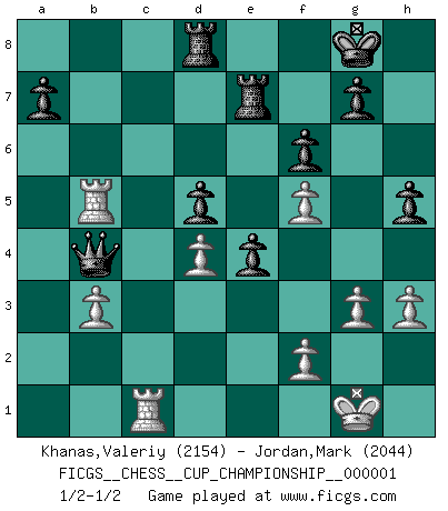 Last move : 1/2-1/2 2017 November 2 7:58:21 [Event "FICGS__CHESS__CUP_CHAMPIONSHIP__000001"] [Site "FICGS"] [Date "2017.09.28"] [Round "1"] [White "Khanas,Valeriy"] [Black "Jordan,Mark"] [Result "1/2-1/2"] [WhiteElo "2154"] [BlackElo "2044"] 1.e4 e5 2.Nf3 Nc6 3.Bb5 Nf6 4.d3 Bc5 5.Bxc6 dxc6 6.Nbd2 O-O 7.O-O Nd7 8.Nc4 f6 9.c3 Nb6 10.Be3 Nxc4 11.Bxc5 Nd6 12.Re1 b6 13.Bxd6 cxd6 14.Qb3+ Rf7 15.d4 Bg4 16.Nh4 Qd7 17.h3 Be6 18.Qd1 Qb7 19.b3 b5 20.Nf5 Bxf5 21.exf5 Re8 22.a4 bxa4 23.Rxa4 d5 24.g3 Qc8 25.Qf3 Qb8 26.c4 Rd8 27.cxd5 cxd5 28.Qc3 e4 29.Rc1 h5 30.Rb4 Qd6 31.Rb5 Re7 32.Qb4 Qxb4 1/2-1/2 Ruy Lopez : Berlin defense Kingside Castling by player Black (move 6) Kingside Castling by player White (move 7) This chess game ended in a draw. Follow this game move after move (download)My style is somewhere between that of Tal and Petrosian. (Reshevsky) Ein Großmeister muß tausende Partien in seinem Kopf speichern, denn diese sind für Ihn, was die Worte der Muttersprache für gewöhnliche Leute sind, oder Noten für Musiker... (Garry Kasparov) Me siento como si fuera una pieza en una partida de Ajedrez, cuando mi oponente me indica: esa pieza no puede ser movida. (Soren Kierkegaard) Shah mat. Le roi est mort. Cri de fierté d'un joueur venant de terrasser son adversaire, courtoisement, sans effusion de sang. There will be no order, only chaos. (Sol Robeson in Pi by Darren Aronofsky)