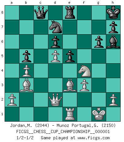 Last move : 1/2-1/2 2017 December 15 6:49:35 [Event "FICGS__CHESS__CUP_CHAMPIONSHIP__000001"] [Site "FICGS"] [Date "2017.09.28"] [Round "1"] [White "Jordan,Mark"] [Black "Munoz Portugal,Guillermo"] [Result "1/2-1/2"] [WhiteElo "2044"] [BlackElo "2150"] 1.e4 c5 2.Nf3 d6 3.d4 cxd4 4.Nxd4 Nf6 5.Nc3 a6 6.Be3 e5 7.Nb3 Be6 8.Be2 Be7 9.Qd3 O-O 10.O-O Nb8d7 11.Nd5 Bxd5 12.exd5 Rc8 13.c4 Ne8 14.Rac1 f5 15.g3 g6 16.Qd2 b6 17.Rc2 Ne8f6 18.f3 Re8 19.Nc1 Bf8 20.b4 f4 21.gxf4 Bh6 22.Nd3 b5 23.cxb5 axb5 24.Rxc8 Qxc8 25.Bd1 Kh8 26.Bb3 Nh5 27.Re1 Nxf4 28.Nxf4 1/2-1/2 Sicilian : Najdorf, Byrne (English) attack Kingside Castling by player Black (move 9) Kingside Castling by player White (move 10) This chess game ended in a draw. Follow this game move after move (download)Not all artists are Chess players, but all Chess players are artists. (Marcel Duchamp) Das Spiel gibt uns die Genugtuung, die das Leben uns versagt. (Emanuel Lasker) Un entendimiento a fondo de las continuaciones tÃpicas del mate, hace de las combinaciones de sacrificio mas complicadas conducirlas a ellas no solo sin dificultad, sino casi de una manera natural. (Siegbert Tarrasch) Roi des jeux et jeu des rois, les échecs portent en eux un sentiment d'infini. Ils donnent à celui qui s'est efforcé d'en approfondir les arcanes l'impression de n'être pas à la mesure de l'homme; en fait, ils constituent un résumé de l'univers, un microcosme, et figurent cette grande échelle qui, dans les plans de la lumière descend jusqu'à la matière, qui des abîmes insondables remonte jusqu'en l'infini de Dieu. (Pyrame) Perfection is achieved, not when there is nothing more to add, but when there is nothing left to take away. (Antoine de Saint-Exupéry)