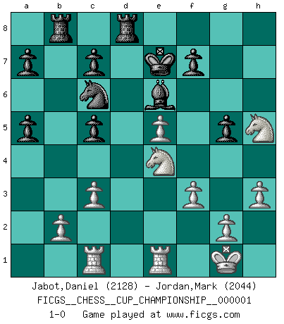 Last move : 1-0 2018 February 17 14:26:57 [Event "FICGS__CHESS__CUP_CHAMPIONSHIP__000001"] [Site "FICGS"] [Date "2017.09.28"] [Round "1"] [White "Jabot,Daniel"] [Black "Jordan,Mark"] [Result "1-0"] [WhiteElo "2128"] [BlackElo "2044"] 1.e4 e5 2.Nf3 Nc6 3.Bb5 Nf6 4.O-O Nxe4 5.d4 Nd6 6.Bxc6 dxc6 7.dxe5 Nf5 8.Qxd8+ Kxd8 9.Nc3 Be7 10.Bg5 Bxg5 11.Nxg5 Ke7 12.Rad1 h6 13.Nge4 b6 14.h3 Ba6 15.Rfe1 g5 16.a4 Rhd8 17.Nf6 Bc4 18.Ng4 c5 19.f3 Be6 20.a5 h5 21.Nf6 Nd4 22.Rc1 bxa5 23.Nce4 Rab8 24.c3 Nc6 25.Nxh5 1-0 This chess game has been lost on time (started : 2017.09.28 20:39:37) Ruy Lopez : Berlin defense, Open variation Kingside Castling by player White (move 4) Player White won this chess game. Follow this game move after move (download)Before the endgame, the Gods have placed the middle game. (Siegbert Tarrasch) Die starken Figuren des Gegners muss man abtauschen. (José Raúl Capablanca) Una partida de Ajedrez se divide en 3 etapas: la primera cuando piensas que tienes la ventaja, la segunda cuando crees que tienes la ventaja y la tercera... ¡cuando te das cuenta que vas a perder!. (Savielly Tartakower) Tout change constamment, y compris dans le monde des Echecs. (Botvinnik) Better than a thousand days of diligent study is one day with a great teacher. (Japanese proverb)