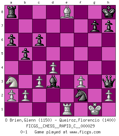 Last move : 0-1 2007 May 26 9:33:28 [Event "FICGS__CHESS__RAPID_C__000029"] [Site "FICGS"] [Date "2007.04.16"] [Round "1"] [White "O Brien,Glenn"] [Black "Queiroz,Florencio"] [Result "0-1"] [WhiteElo "1150"] [BlackElo "1400"] 1.e4 e5 2.Nf3 Nc6 3.Bb5 a6 4.Ba4 Nf6 5.O-O Be7 6.Re1 b5 7.Bb3 O-O 8.c3 d5 9.exd5 Nxd5 10.Nxe5 Nxe5 11.Rxe5 c6 12.d4 Bd6 13.Re1 Qh4 14.g3 Qh3 15.Be3 Bg4 16.Qd3 Bf5 17.Qd1 Be4 18.f3 Bxg3 19.Qe2 Bd3 20.Qd2 Nxe3 21.Na3 Bxe1 22.Rxe1 Rfe8 23.Qf2 Ng4 24.Bxf7+ Kh8 25.Bxe8 Nxf2 0-1 Ruy Lopez : Closed, 7...O-O Kingside Castling by player White (move 5) Kingside Castling by player Black (move 7) Player Black won this chess game. Follow this game move after move (download)In complicated positions, Bobby Fischer hardly had to be afraid of anybody. (Paul Keres) Viele Opfer benötigen überhaupt keine konkrete Berechnung. Es genügt sich die entstehende Position kurz vorzustellen, um uns davon zu überzeugen, dass das Opfer korrekt ist. (Mikhail Nekhemyevich Tal) Los finales de Peón son del Ajedrez lo que el cesped es del Golf. (Cecil Purdy) Demandez au pauvre Cg1 ce qu'il en pense. Eduard Gufeld à propos de la variante Saemisch de l'Est-Indienne. Your best chance to get a Royal Flush in a casino is in the bathroom. (Anonymous)