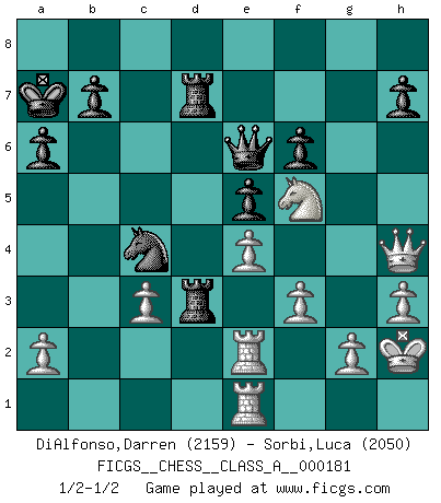 Last move : 1/2-1/2 2018 May 20 17:11:19 [Event "FICGS__CHESS__CLASS_A__000181"] [Site "FICGS"] [Date "2017.10.02"] [Round "1"] [White "DiAlfonso,Darren"] [Black "Sorbi,Luca"] [Result "1/2-1/2"] [WhiteElo "2159"] [BlackElo "2050"] 1.d4 Nf6 2.c4 e6 3.Nf3 d5 4.Nc3 Bb4 5.Bg5 dxc4 6.e4 c5 7.Bxc4 cxd4 8.Nxd4 Bxc3+ 9.bxc3 Qa5 10.Bb5+ Bd7 11.Bxf6 gxf6 12.Bxd7+ Nxd7 13.O-O a6 14.Rb1 Qc7 15.Qh5 Nc5 16.Rfe1 O-O-O 17.Qh6 Nd3 18.Re2 Rd7 19.Qxf6 Rhd8 20.Qf3 Ne5 21.Qg3 Nc4 22.Qg5 e5 23.Nf5 Qb6 24.Rf1 f6 25.Qh4 Kb8 26.h3 Ka7 27.Kh2 Rc7 28.Rfe1 Rd3 29.Qh6 Qe6 30.f3 Rcd7 31.Rb1 Nd2 32.Rbe1 Nc4 33.Qh4 1/2-1/2 Queen's pawn game Kingside Castling by player White (move 13) Queenside Castling by player Black (move 16) This chess game ended in a draw. Follow this game move after move (download)It is no time to be playing Chess when the house is on fire. (Italian Proverb) Ich hatte Zahnschmerzen im ersten Spiel. In der zweiten Partie tat mir der Kopf weh. In der dritten war es eine Rheuma-Attacke und während der vierten fühlte ich mich nicht gut. Und in der fünften? Nun, man muss doch nicht jedes Spiel gewinnen, oder? (Savielly Grigorievitsch Tartakower) No hay precio que sea tan grande por la cabellera del Rey enemigo. (Koblentz) Ce qui caractérise les parties de combat, c'est que si le défenseur a constamment de difficiles problèmes à résoudre, l'attaquant doit chercher sans relâche de nouvelles possibilités d'attaque. (Koblentz) Industry executives and analysts often mistakenly talk about strategy as if it were some kind of chess match. But in chess, you have just two opponents, each with identical resources, and with luck playing a minimal role. The real world is much more like a poker game, with multiple players trying to make the best of whatever hand fortune has dealt them. In our industry, Bill Gates owns the table until someone proves otherwise. (David Moschella, 'Computerworld')