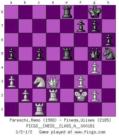 Last move : 1/2-1/2 2018 August 5 21:52:23 [Event "FICGS__CHESS__CLASS_A__000181"] [Site "FICGS"] [Date "2017.10.02"] [Round "1"] [White "Pareschi,Remo"] [Black "Pineda,Ulises"] [Result "1/2-1/2"] [WhiteElo "1988"] [BlackElo "2185"] 1.d4 Nf6 2.c4 e6 3.Nc3 Bb4 4.Qc2 d5 5.Nf3 c5 6.cxd5 exd5 7.Bg5 O-O 8.e3 h6 9.Bh4 cxd4 10.Nxd4 Nc6 11.Nxc6 bxc6 12.a3 Bd6 13.Rc1 Be6 14.Be2 Qe7 15.O-O Rfc8 16.Rfd1 a5 17.Bg3 Rab8 18.Ba6 Re8 19.Na4 Bxg3 20.hxg3 Ne4 21.Bd3 d4 22.Qe2 Bb3 23.Bc2 dxe3 24.Qxe3 Bxc2 25.Rxc2 Qb7 26.Rdc1 Qb5 27.Nc3 Qb3 28.Qf3 Nf6 29.Rd2 Qb6 30.Na4 Qb5 31.Nc3 Qg5 32.Qf4 Qh5 33.Qh4 Qg6 34.f3 Qf5 35.Kh2 Re5 36.Qd4 Rbe8 37.Kg1 Qg6 38.Kf2 Nh5 39.g4 c5 40.Qd3 Qg5 1/2-1/2 Nimzo-Indian : Classical, Noa variation Kingside Castling by player Black (move 7) Kingside Castling by player White (move 15) This chess game ended in a draw. Follow this game move after move (download)I play correspondence chess because it is both art and science while chess is art only. (A player at FICGS) Ich spiele 70 Eröffnungssysteme. (Viktor Kortschnoi) El Ajedrez demanda una total concentración. (Bobby Fischer) Même si l'adversaire joue le coup analysé précédemment, recommencez l'analyse en voyant la nouvelle position. Première règle de Blumenfeld Sometimes it pays to stay in bed in Monday, rather than spending the rest of the week debugging Monday's code. (Dan Salomon)