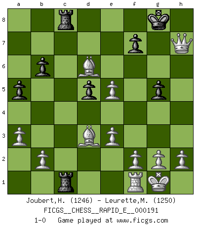 Last move : 1-0 2017 October 18 16:50:12 [Event "FICGS__CHESS__RAPID_E__000191"] [Site "FICGS"] [Date "2017.10.07"] [Round "1"] [White "Joubert,Hennie"] [Black "Leurette,Marc-Antoine"] [Result "1-0"] [WhiteElo "1246"] [BlackElo "1250"] 1.d4 d5 2.c4 e6 3.Nc3 Nf6 4.Bg5 Be7 5.Nf3 h6 6.Bh4 O-O 7.e3 b6 8.Bd3 Bb7 9.O-O Nc6 10.Rc1 Qd7 11.cxd5 exd5 12.a3 a5 13.Nb5 Ba6 14.Ne5 Nxe5 15.dxe5 Nh7 16.Rxc7 Qe6 17.Rxe7 Qxe7 18.Bxe7 Rfc8 19.Bd6 Bxb5 20.Bxb5 g5 21.Qh5 Rc2 22.Qxh6 Rac8 23.Bd3 Rc1 24.Qxh7+ 1-0 QGD : 4.Bg5 Be7 Kingside Castling by player Black (move 6) Kingside Castling by player White (move 9) Player White won this chess game. Follow this game move after move (download)Botvinnik tried to take the mystery out of Chess, always relating it to situations in ordinary life. He used to call Chess a typical inexact problem similar to those which people are always having to solve in everyday life. (Garry Kasparov) Über Karpov: Er war und ist ein Vertreter der russischen Reaktionäre. Das steckt tief in seiner Seele, wehalb ich nicht nett mit ihm umgehen kann. (Viktor Kortschnoi) Ayuda a tus piezas para que ellas te puedan ayudar. (Paul Morphy) Les échecs sont un jeu par leur forme, un art par leur essence et une science par sa difficulté d'acquisition. Ils peuvent vous procurer autant de plaisir qu'un bon livre ou une belle musique, mais vous n'aurez une réelle joie que si vous arrivez à bien jouer. (Tigran Petrosian) Tomorrow's what you make of it. (Horatio Caine, C.S.I. Miami)