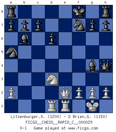 Last move : 0-1 2007 May 11 13:7:13 [Event "FICGS__CHESS__RAPID_C__000029"] [Site "FICGS"] [Date "2007.04.16"] [Round "1"] [White "Litzenburger,Xavier"] [Black "O Brien,Glenn"] [Result "0-1"] [WhiteElo "1200"] [BlackElo "1150"] 1.e4 e5 2.Nf3 Nc6 3.Bc4 Bc5 4.b4 Bxb4 5.c3 Ba5 6.d4 exd4 7.O-O dxc3 8.Qb3 Qf6 9.Bg5 Qg6 10.Nxc3 Nf6 11.Nd5 Nxe4 12.Nf4 Qf5 13.Nd3 Nxg5 14.Nh4 Qg4 15.Nc5 Qxh4 16.Rad1 Bb6 17.Nd3 Na5 18.Bxf7+ Nxf7 19.Rfe1+ Kf8 20.Qc2 d6 21.Qe2 Bg4 0-1 Evans gambit : compromised defense Kingside Castling by player White (move 7) Player Black won this chess game. Follow this game move after move (download)When you don't know what to play, wait for an idea to come into your opponent's mind. You may be sure that idea will be wrong. (Siegbert Tarrasch) Ich weiss nicht was Gott gegen mich auf 1.e4 antworten würde. (Robert James Fischer) Aunque la mayoría de la gente disfruta observar las partidas de los grandes Maestros de ataque, algunos de los jugadores mas notables en la historia han sido los jugadores silenciosos posicionales. Lentamente ellos te aplastan despojandote de tu espacio, congestionando tus piezas y dejandote virtualmente sin nada que hacer. (Yasser Seirawan) Les réformistes prétendent que les progrès de la théorie conduiront à la disparition des échecs, et qu'il faut, pour leur rendre vie, en remanier les règles. En réalité, qu'exprime cette affirmation? Le mépris de l'intuition, de l'imagination et de tous les autres éléments qui font des échecs un art. (Alexander Alekhine) Real knowledge is to know the extent of one's ignorance. (Confucius)