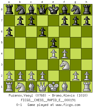 Last move : 0-1 2017 November 10 2:11:5 [Event "FICGS__CHESS__RAPID_E__000191"] [Site "FICGS"] [Date "2017.10.07"] [Round "1"] [White "Puzanov,Vasyl"] [Black "Bromo,Alexis"] [Result "0-1"] [WhiteElo "0768"] [BlackElo "1010"] 1.e4 e5 2.f4 d6 3.Nf3 a6 0-1 This chess game has been lost on time (started : 2017.10.07 17:33:18) King's gambit Player Black won this chess game. Follow this game move after move (download)If I win a tournament, I win it by myself. I do the playing. Nobody helps me. (Bobby Fischer) Ich würde die 30 stärksten Spieler der USA im Simultanspiel besiegen. (José Raúl Capablanca) Combinaciones deslumbrantes son para la mayoría, mover madera es para los pocos. (Georg Kieninger) A ce moment-là, je menaçais de comprendre la position ! (Clément L'Heureux) I fear not the man who has practiced 10,000 kicks once, but I fear the man who has practiced one kick 10,000 times. (Bruce Lee)