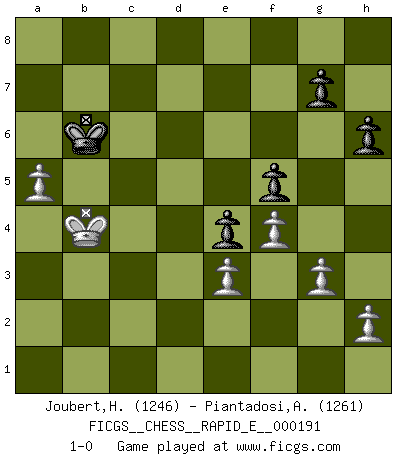 Last move : 1-0 2017 December 8 21:55:5 [Event "FICGS__CHESS__RAPID_E__000191"] [Site "FICGS"] [Date "2017.10.07"] [Round "1"] [White "Joubert,Hennie"] [Black "Piantadosi,Angelo"] [Result "1-0"] [WhiteElo "1246"] [BlackElo "1261"] 1.d4 d5 2.c4 e6 3.Nc3 Nf6 4.Bg5 Nbd7 5.e3 Be7 6.Nf3 O-O 7.Bd3 dxc4 8.Bxc4 a6 9.O-O b5 10.Bb3 Bb7 11.a3 c5 12.dxc5 Nxc5 13.Bc2 Qxd1 14.Raxd1 Rad8 15.Rxd8 Rxd8 16.Rd1 Rxd1+ 17.Bxd1 h6 18.Bh4 Kf8 19.Bc2 Nfe4 20.Bxe7+ Kxe7 21.Nxe4 Bxe4 22.Bxe4 Nxe4 23.Kf1 Kd6 24.Ke2 f6 25.Nd2 Nxd2 26.Kxd2 Kd5 27.Kd3 f5 28.f4 e5 29.g3 e4+ 30.Kc3 a5 31.b3 a4 32.bxa4 bxa4 33.Kb4 Kc6 34.Kxa4 Kc5 35.Kb3 Kb5 36.a4+ Ka5 37.Ka3 Ka6 38.Kb4 Kb6 39.a5+ 1-0 QGD Kingside Castling by player Black (move 6) Kingside Castling by player White (move 9) Player White won this chess game. Follow this game move after move (download)White lost because he failed to remember the right continuation and had to think up the moves himself. (Siegbert Tarrasch) Nicht daß Diemer aus Opportunismus Mitglied der NSDAP geworden wäre. Er war ein Fanatiker, in allem, was er tat. (Hans Ree) La mitad de las variaciones que son calculadas en una partida de torneo, resultan ser completamente superfluas. Desafortunadamente, nadie sabe por adelantado cual mitad. (Jan Tinman) Aux échecs, l'amour-propre est satisfait quand on remporte la victoire, mais il n'y a pas de honte à être battu. (Benjamin Franklin) God is an atheist. (Unknown)