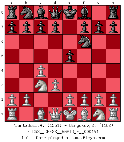 Last move : 1-0 2017 November 10 2:11:5 [Event "FICGS__CHESS__RAPID_E__000191"] [Site "FICGS"] [Date "2017.10.07"] [Round "1"] [White "Piantadosi,Angelo"] [Black "Biryukov,Sergey"] [Result "1-0"] [WhiteElo "1261"] [BlackElo "1162"] 1.c4 Nf6 2.Nc3 e5 3.d3 1-0 This chess game has been lost on time (started : 2017.10.07 17:33:18) English Opening Player White won this chess game. Follow this game move after move (download)We like to think. (Gary Kasparov) Im Blitz ist es einfacher mit einer Figur weniger anzugreifen, als sich mit einer Mehrfigur zu verteidigen. (Mikhail Nekhemyevich Tal) El Ajedrez es un juego de pelea el cual es puramente intelectual e incluye la suerte. (Richard Reti) Il n'y a pas eu de défaite parce que je ne crois pas que cet ordinateur ait jamais existé. IBM a triché en refusant d'imprimer les modes de recherche de la machine. C'est évident, pendant le match, des coups décisifs ont été joués par des êtres humains. Aujourd'hui, les meilleurs spécialistes en informatique ne peuvent toujours pas expliquer comment Deep-Blue a pu jouer contre la logique des ordinateurs. IBM a gagné une guerre de communication, mais ils sont incapables de prouver que l'ordinateur a gagné tout seul. (Garry Kasparov) You can only get smarter by playing a smarter opponent. (Revolver, movie)