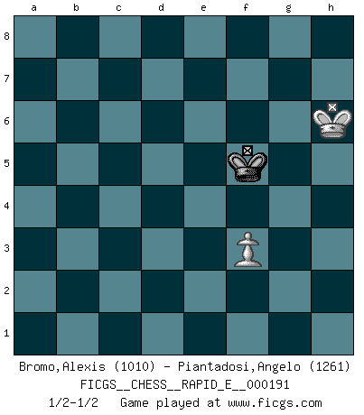 Last move : 1/2-1/2 2017 December 11 20:31:46 [Event "FICGS__CHESS__RAPID_E__000191"] [Site "FICGS"] [Date "2017.10.07"] [Round "1"] [White "Bromo,Alexis"] [Black "Piantadosi,Angelo"] [Result "1/2-1/2"] [WhiteElo "1010"] [BlackElo "1261"] 1.d4 d5 2.c4 e6 3.Nf3 Nf6 4.a3 dxc4 5.Nc3 c5 6.e3 cxd4 7.exd4 Nc6 8.Bxc4 a6 9.O-O Be7 10.Re1 O-O 11.h3 b5 12.Bb3 Bb7 13.d5 exd5 14.Nxd5 Nxd5 15.Qxd5 Qc7 16.Qd3 Bf6 17.Bc2 g6 18.Bg5 Bxg5 19.Nxg5 Rad8 20.Qc3 Qf4 21.Nf3 Nd4 22.Nxd4 Qxd4 23.Qxd4 Rxd4 24.Rad1 Rfd8 25.Rxd4 Rxd4 26.Re7 Bc6 27.Ra7 Rd2 28.Bb3 Rxb2 29.Bxf7+ Kf8 30.Rxa6 Kxf7 31.Rxc6 Ra2 32.Rb6 Rxa3 33.Rxb5 Kg7 34.g3 Ra7 35.Kg2 Ra2 36.g4 Ra7 37.Kg3 h6 38.f3 g5 39.h4 gxh4+ 40.Kxh4 Rf7 41.Rf5 Rxf5 42.gxf5 Kf6 43.Kh5 Kxf5 44.Kxh6 1/2-1/2 Queen's gambit declined Kingside Castling by player White (move 9) Kingside Castling by player Black (move 10) 10 pieces endgame at move 32 : White KRPPP , Black KRPPP WHITE : King + 1 Rook 3 Pawns BLACK : King + 1 Rook 3 Pawns 9 pieces endgame at move 33 : White KRPPP , Black KRPP WHITE : King + 1 Rook 3 Pawns BLACK : King + 1 Rook 2 Pawns 8 pieces endgame at move 39 : White KRPP , Black KRPP WHITE : King + 1 Rook 2 Pawns BLACK : King + 1 Rook 2 Pawns 7 pieces endgame at move 40 : White KRPP , Black KRP WHITE : King + 1 Rook 2 Pawns BLACK : King + 1 Rook 1 Pawn 6 pieces endgame at move 41 : White KPP , Black KRP WHITE : King + 2 Pawns BLACK : King + 1 Rook 1 Pawn 5 pieces endgame at move 42 : White KPP , Black KP WHITE : King + 2 Pawns BLACK : King + 1 Pawn 4 pieces endgame at move 43 : White KP , Black KP WHITE : King + 1 Pawn BLACK : King + 1 Pawn 3 pieces endgame at move 44 : White KP , Black K WHITE : King + 1 Pawn BLACK : King + This chess game ended in a draw. Follow this game move after move (download)By playing at Chess then, we may learn: First: Foresight... Second: Circumspection... Third: Caution... And lastly, we learn by Chess the habit of not being discouraged by present bad appearances in the state of our affairs, the habit of hoping for a favorable chance, and that of persevering in the secrets of resources. (Benjamin Franklin) Die Partien sind immer verschieden, die Interviews immer die gleichen. (Garry Kasparov) Cuando tu casa esta en llamas, no puedes ser molestado por tus vecinos. O, como decinos en Ajedrez, si tu Rey esta bajo ataque, no te preocupa perder un Peón del lado de la Reina. (Gary Kasparov) Mon pion favori sur ma case favorite ! Bronstein en parlant d'un coup de pion en h5 quand il avait les Noirs. To send light into the darkness of men's hearts - such is the duty of the artist. (Schumann)