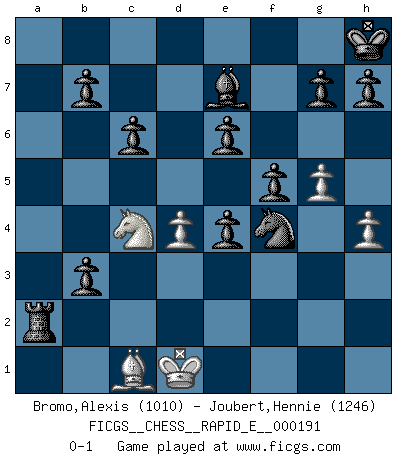 Last move : 0-1 2017 November 14 12:41:52 [Event "FICGS__CHESS__RAPID_E__000191"] [Site "FICGS"] [Date "2017.10.07"] [Round "1"] [White "Bromo,Alexis"] [Black "Joubert,Hennie"] [Result "0-1"] [WhiteElo "1010"] [BlackElo "1246"] 1.d4 d5 2.c4 c6 3.e3 Bf5 4.Nc3 e6 5.Nf3 Nf6 6.h3 Be7 7.a3 O-O 8.Bd3 Bxd3 9.Ne5 Bxc4 10.b3 Ba6 11.Nd3 Nbd7 12.O-O Ne4 13.Bb2 f5 14.f4 Kh8 15.b4 Nb6 16.Nxe4 dxe4 17.Ne5 Bxf1 18.Kxf1 Nd5 19.Bc1 a5 20.Qh5 Qe8 21.Qxe8 Rfxe8 22.g4 axb4 23.Bb2 Nxe3+ 24.Ke2 Nd5 25.a4 Ra5 26.Bc1 Rea8 27.g5 Rxa4 28.Rxa4 Rxa4 29.h4 Ra2+ 30.Kd1 b3 31.Nc4 Nxf4 0-1 QGD Slav defense Kingside Castling by player Black (move 7) Kingside Castling by player White (move 12) Player Black won this chess game. Follow this game move after move (download)Chess is the gymnasium of the mind. (Blaise Pascal) Im Schach gibt es keinen Platz für Galanterie. (Irving Chernev) Nunca nadie ha ganado una partida de Ajedrez rindiendose. (Unknown) Des idées, des idées, j'en ai cent, j'en ai mille. Des bonnes, des mauvaises, applicables, irréalisables... Il suffit de faire le tri ! (Roos) For to win one hundred victories in one hundred battles is not the acme of skill. To subdue the enemy without fighting is the acme of skill. (Sun Tzu)
