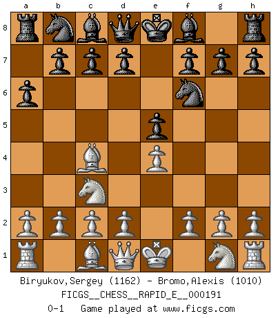Last move : 0-1 2017 November 16 3:49:50 [Event "FICGS__CHESS__RAPID_E__000191"] [Site "FICGS"] [Date "2017.10.07"] [Round "1"] [White "Biryukov,Sergey"] [Black "Bromo,Alexis"] [Result "0-1"] [WhiteElo "1162"] [BlackElo "1010"] 1.e4 e5 2.Bc4 Nf6 3.Nc3 a6 0-1 This chess game has been lost on time (started : 2017.10.07 17:33:18) Bishop's Opening : Berlin defense Player Black won this chess game. Follow this game move after move (download)A sacrifice is best refuted by accepting it. (Wilhelm Steinitz) Der Umstand, daß uns eine 7 Stunden Zeitkontrolle ermöglicht eine großartige, tiefe Partie zu spielen, ist für die Massenmedien nicht weiter von Bedeutung. (Alexej Shirov) El Ajedrez es tan inspirador que yo no creo que un buen jugador sea capaz de tener un pensamiento malo durante una partida. (Wilhelm Steinitz) Ce qui est bien, c'est d'avoir tout un tas de pièces en prise : l'adversaire ne peut en prendre qu'une à la fois. Cité par Thierry Audin. I know the human being and fish can coexist peacefully. (George W. Bush, Saginaw sept. 29, 2000)