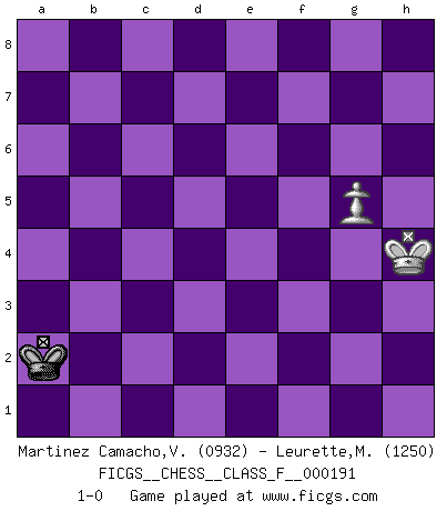 Last move : 1-0 2017 December 6 13:35:21 [Event "FICGS__CHESS__CLASS_F__000191"] [Site "FICGS"] [Date "2017.10.08"] [Round "1"] [White "Martinez Camacho,Victor Hugo"] [Black "Leurette,Marc-Antoine"] [Result "1-0"] [WhiteElo "0932"] [BlackElo "1250"] 1.e4 e5 2.Nf3 Nc6 3.Bb5 Nf6 4.d3 Bc5 5.Bxc6 dxc6 6.O-O Bg4 7.Be3 Qd6 8.Nbd2 Bxe3 9.fxe3 O-O-O 10.h3 Bxf3 11.Nxf3 h5 12.Ng5 Rd7 13.Kh1 h4 14.Qe2 g6 15.Qf3 Rh5 16.Qxf6 Qxf6 17.Rxf6 Rxg5 18.Raf1 Rg3 19.Rxf7 Rxf7 20.Rxf7 Rxe3 21.Rf2 Kd7 22.Rd2 Kd6 23.Kg1 g5 24.Kf2 Rg3 25.d4 g4 26.dxe5+ Kxe5 27.hxg4 Rxg4 28.Rd7 Kxe4 29.Rxc7 Rg3 30.Rxb7 c5 31.Rxa7 Kd4 32.Ra4+ c4 33.b3 Rc3 34.Rxc4+ Rxc4 35.bxc4 Kxc4 36.Kf3 Kc3 37.Kg4 Kxc2 38.Kxh4 Kb2 39.g4 Kxa2 40.g5 1-0 Ruy Lopez : Berlin defense Kingside Castling by player White (move 6) Queenside Castling by player Black (move 9) 10 pieces endgame at move 31 : White KRPPPP , Black KRPP WHITE : King + 1 Rook 4 Pawns BLACK : King + 1 Rook 2 Pawns 9 pieces endgame at move 34 : White KRPPPP , Black KRP WHITE : King + 1 Rook 4 Pawns BLACK : King + 1 Rook 1 Pawn 8 pieces endgame at move 34 : White KPPPP , Black KRP WHITE : King + 4 Pawns BLACK : King + 1 Rook 1 Pawn 7 pieces endgame at move 35 : White KPPPP , Black KP WHITE : King + 4 Pawns BLACK : King + 1 Pawn 6 pieces endgame at move 35 : White KPPP , Black KP WHITE : King + 3 Pawns BLACK : King + 1 Pawn 5 pieces endgame at move 37 : White KPP , Black KP WHITE : King + 2 Pawns BLACK : King + 1 Pawn 4 pieces endgame at move 38 : White KPP , Black K WHITE : King + 2 Pawns BLACK : King + 3 pieces endgame at move 39 : White KP , Black K WHITE : King + 1 Pawn BLACK : King + Player White won this chess game. Follow this game move after move (download)Capture of the adverse King is the ultimate but not the first object of the game. (William Steinitz) Die Fehler sind da, Sie warten nur darauf gemacht zu werden. (Savielly Grigorievitsch Tartakower) Cuando estes solo, cuando te sientas un extraño en el mundo, juega al Ajedrez. Esto levantará tu espiritu y será tu consejero de guerra. (Aristóteles) Les Echecs sont et restent toujours un combat, un combat intégral comme la boxe, la lutte ou un autre sport, et où il doit y avoir un vainqueur et un vaincu. (Joseph Emil Diemer) He who laughs last probably does not get the joke. (Unknown)