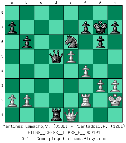 Last move : 0-1 2017 November 30 13:59:51 [Event "FICGS__CHESS__CLASS_F__000191"] [Site "FICGS"] [Date "2017.10.08"] [Round "1"] [White "Martinez Camacho,Victor Hugo"] [Black "Piantadosi,Angelo"] [Result "0-1"] [WhiteElo "0932"] [BlackElo "1261"] 1.e4 c5 2.Nc3 d6 3.g3 g6 4.Bg2 Bg7 5.Nge2 Nc6 6.O-O Nf6 7.d3 O-O 8.h3 b6 9.Be3 Bb7 10.Qd2 Nd4 11.Bh6 Nxe2+ 12.Nxe2 d5 13.Bxg7 Kxg7 14.e5 Nd7 15.f4 Qc7 16.Rad1 d4 17.Bxb7 Qxb7 18.c3 e6 19.cxd4 cxd4 20.Nxd4 Rad8 21.Nf3 Nc5 22.Qc3 Rd5 23.Ng5 Rfd8 24.Rd2 Rxd3 25.Rxd3 Rxd3 26.Qe1 Qd5 27.Kh2 Rd2+ 28.Rf2 Rd1 29.Nxe6+ Nxe6 0-1 Sicilian : Closed Kingside Castling by player White (move 6) Kingside Castling by player Black (move 7) Player Black won this chess game. Follow this game move after move (download)There is no remorse like the remorse of Chess. (H. G. Wells) Das Schachspiel ist ein See, in welchem eine Mücke baden und ein Elefant ertrinken kann. (Emanuel Lasker) El jugador blanco perdió porque fallo en recordar la coreccta continuación y tuvo que pensar por sí mismo las movidas. (Siegbert Tarrasch) Pour moi, les échecs ne sont pas un jeu mais un art. (Alexandre Alekhine) Wisdom is the reward you get for a lifetime of listening when you'd have preferred to talk. (Doug Larson)