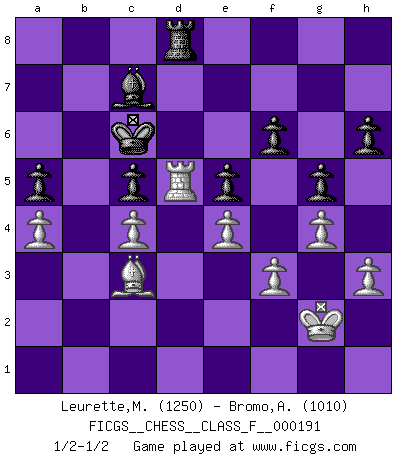 Last move : 1/2-1/2 2017 November 6 18:13:54 [Event "FICGS__CHESS__CLASS_F__000191"] [Site "FICGS"] [Date "2017.10.08"] [Round "1"] [White "Leurette,Marc-Antoine"] [Black "Bromo,Alexis"] [Result "1/2-1/2"] [WhiteElo "1250"] [BlackElo "1010"] 1.e4 e5 2.Nf3 Nc6 3.Bc4 h6 4.d4 d6 5.dxe5 Nxe5 6.Nxe5 dxe5 7.Qxd8+ Kxd8 8.O-O f6 9.Rd1+ Bd7 10.b3 a6 11.Be6 Bd6 12.Bxd7 Kxd7 13.c4 c5 14.Nc3 Ne7 15.Nd5 Nxd5 16.Rxd5 Rhe8 17.Ba3 b6 18.Rad1 Re6 19.R1d3 Rc8 20.Bb2 b5 21.a3 g5 22.Bc3 Kc6 23.g4 Rd8 24.Kg2 R6e8 25.h3 Bc7 26.f3 Rxd5 27.Rxd5 bxc4 28.bxc4 a5 29.a4 Rd8 1/2-1/2 King's pawn game Kingside Castling by player White (move 8) This chess game ended in a draw. Follow this game move after move (download)I still hope to kill Fischer. (Boris Spassky) Stil? Ich habe keinen Stil! (Anatoly Karpov) El Ajedrez tiene tanto misterio como las mujeres. (Purdy) Un millionnaire : 'Monsieur Steinitz ! Vous ne participez aux tournois que pour l'argent, alors que moi je n'y viens que pour l'honneur.' Steinitz : 'Chacun joue pour ce qu'il n'a pas'... Have no fear of perfection - you'll never reach it. (Salvador Dali)