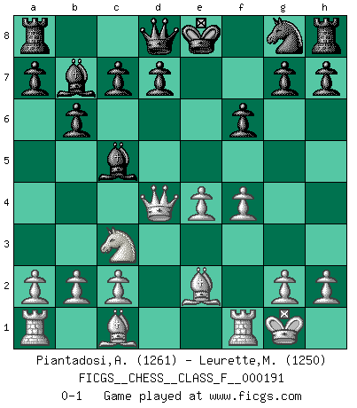 Last move : 0-1 2017 October 17 22:58:24 [Event "FICGS__CHESS__CLASS_F__000191"] [Site "FICGS"] [Date "2017.10.08"] [Round "1"] [White "Piantadosi,Angelo"] [Black "Leurette,Marc-Antoine"] [Result "0-1"] [WhiteElo "1261"] [BlackElo "1250"] 1.e4 e5 2.Nf3 Nc6 3.d4 exd4 4.Nxd4 Nxd4 5.Qxd4 b6 6.Nc3 Bb7 7.Be2 Be7 8.O-O f6 9.f4 Bc5 0-1 Scotch game Kingside Castling by player White (move 8) Player Black won this chess game. Follow this game move after move (download)When in doubt... play Chess ! (Tevis) Der Partner hat auch seine Existenzberechtigung. (Savielly Grigorievitsch Tartakower) El Ajedrez es un mar en el cual un mosquito puede beber y un elefante puede bañarse. (Refrán Hindú) La vérité est comme le meilleur coup aux échecs : elle existe, mais il faut la chercher. (Arturo Perez-Reverte) The quality of decision is like the well-timed swoop of a falcon which enables it to strike and destroy its victim. (Sun Tzu)