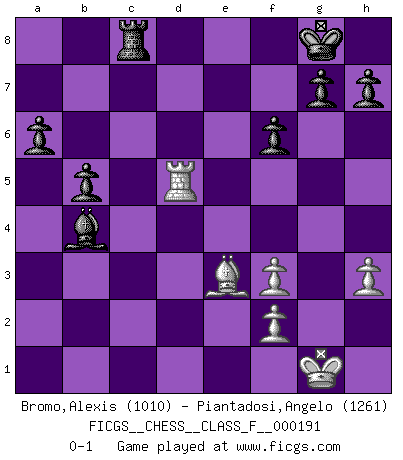 Last move : 0-1 2017 November 18 14:12:0 [Event "FICGS__CHESS__CLASS_F__000191"] [Site "FICGS"] [Date "2017.10.08"] [Round "1"] [White "Bromo,Alexis"] [Black "Piantadosi,Angelo"] [Result "0-1"] [WhiteElo "1010"] [BlackElo "1261"] 1.d4 d5 2.c4 e6 3.a3 dxc4 4.Nc3 Nf6 5.e3 c5 6.Nf3 Nc6 7.Bxc4 cxd4 8.exd4 a6 9.h3 b5 10.Ba2 Be7 11.O-O O-O 12.Re1 Bb7 13.Be3 Rc8 14.b4 Nxb4 15.axb4 Rxc3 16.Rc1 Rxc1 17.Qxc1 Bxf3 18.gxf3 Bxb4 19.Rd1 Qc8 20.Qxc8 Rxc8 21.d5 Nxd5 22.Bxd5 exd5 23.Rxd5 f6 0-1 Queen's gambit declined Kingside Castling by player White (move 11) Kingside Castling by player Black (move 11) Player Black won this chess game. Follow this game move after move (download)You can only get good at Chess if you love the game. (Bobby Fischer) Als ich elf wurde, wurde ich einfach gut. (Robert James Fischer) El Ajedrez es imaginación. (David Bronstein) Echiquier : carré parfait, comme la Jérusalem nouvelle décrite par l'auteur de l'Apocalypse, huit cases sur huit, exaltation du chiffre 4, symbole du cosmos aux quatre horizons... où le noir et le blanc, l'ombre et la lumière, le mal et le bien s'entremêlent et se conjuguent. (Robert Couffignal, Le Gambit du poète) If only people were all showed a certain minimum level of niceness; if only people didn't retract verbal draw offers (without draw box ticked) on ficgs; if only people didn't kill; if only people didn't run concentration / extermination camps, if only people didn't drop nuclear bombs on Hiroshima and Nagasaki, and so on - it would be a much more beautiful world. But sadly, things are not so... (Normajean Yates)