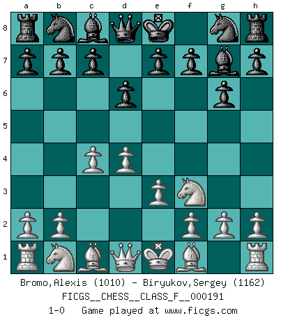 Last move : 1-0 2017 November 24 5:44:0 [Event "FICGS__CHESS__CLASS_F__000191"] [Site "FICGS"] [Date "2017.10.08"] [Round "1"] [White "Bromo,Alexis"] [Black "Biryukov,Sergey"] [Result "1-0"] [WhiteElo "1010"] [BlackElo "1162"] 1.d4 d6 2.c4 g6 3.Nf3 Bg7 4.e3 1-0 This chess game has been lost on time (started : 2017.10.08 11:8:38) Old Indian defense Player White won this chess game. Follow this game move after move (download)Bobby Fischer's current state of mind is indeed a tragedy. One of the world's greatest Chess players - the pride and sorrow of American Chess. (Frank Brady) Je älter ich werde, um so mehr schätze ich die Bauern. (Paul Keres) Un buen jugador siempre tiene buena suerte. (José Raúl Capablanca) Il a essayé de se convaincre qu'il pourrait empêcher toutes les erreurs et ne jamais perdre. L'horreur ! Gary Kasparov au sujet de Robert Fischer. I take risks, sometimes patients die, but not taking risks causes more patients to die. So I guess my biggest problem is I've been cursed with the ability to do the math. (Gregory House, House M.D.)