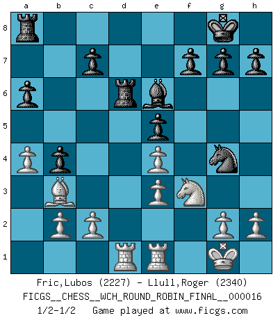 Last move : 1/2-1/2 2017 November 27 15:8:54 [Event "FICGS__CHESS__WCH_ROUND_ROBIN_FINAL__000016"] [Site "FICGS"] [Date "2017.10.14"] [Round "1"] [White "Fric,Lubos"] [Black "Llull,Roger"] [Result "1/2-1/2"] [WhiteElo "2227"] [BlackElo "2340"] 1.e4 e5 2.Nf3 Nc6 3.Bb5 a6 4.Ba4 Nf6 5.O-O Be7 6.Re1 b5 7.Bb3 O-O 8.a4 b4 9.d4 d6 10.dxe5 Nxe5 11.Nxe5 dxe5 12.Qxd8 Rxd8 13.Nd2 Bc5 14.Nf3 Ng4 15.Be3 Bxe3 16.fxe3 Rd6 17.Rad1 Be6 1/2-1/2 Ruy Lopez : Closed, 7...O-O Kingside Castling by player White (move 5) Kingside Castling by player Black (move 7) This chess game ended in a draw. Follow this game move after move (download)It is always better to sacrifice your opponent's men. (Savielly Tartakower) Meine Liebe ist Schach, Schach, Schach. Ich muss jeden Tag Schach spielen, deshalb fühle ich mich so stark. (Miguel Najdorf) El Ajedrez es el juego mas altamente simbólico, pero las agresiones estan por lo tanto aún mas francamente representadas en la partida. Tal vez comenzo como un juego de guerra; Algo como la representación de una batalla en miniatura entre las fuerzas de dos reinos. (Karl Meninger) Vous savez, camarade Pachman, je n'éprouve pas de plaisir à être ministre, je jouerais plutôt aux échecs comme vous, ou alors ferais une révolution au Venezuela. (Che Guevara à Ludek Pachman, 'Checkmate in Prague', 1975) Perseverance does not equal worthiness. Next time you want to get my attention, wear something fun. Low-riding jeans are hot. (Gregory House, House M.D.)
